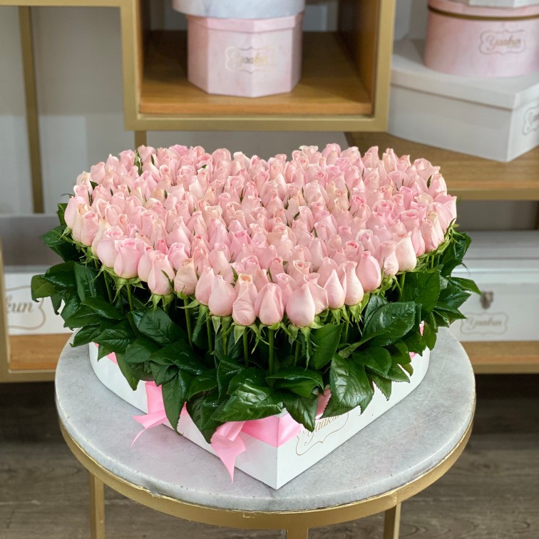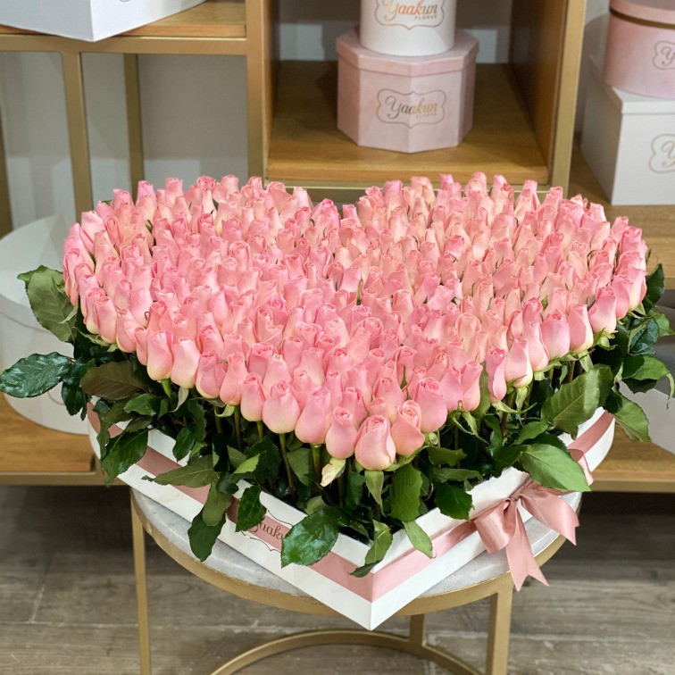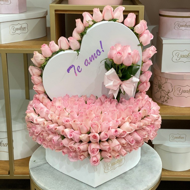 Hermoso arreglo floral con 200 rosas rositas en forma de corazón
