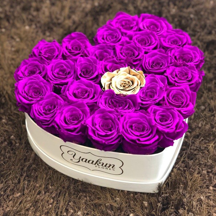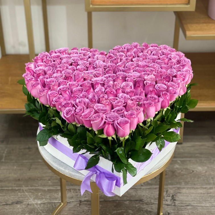 Hermoso arreglo en caja de corazón con 200 rosas lilas altas