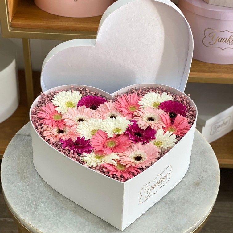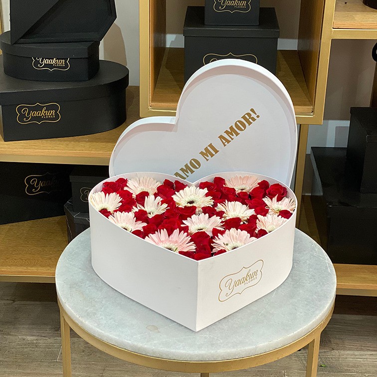 Hermoso arreglo floral en caja de corazón con 20 gerberas aprox y contorno de gypso rosita