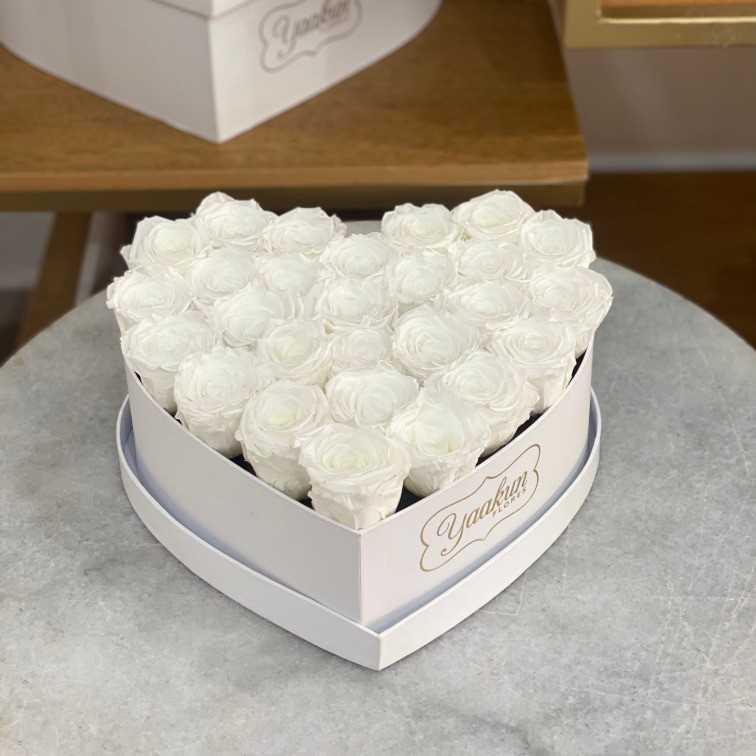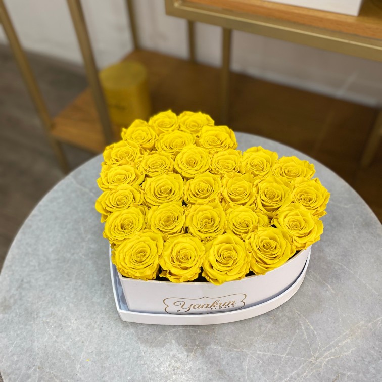 Hermoso arreglo floral con 27 rosas eternas amarillas