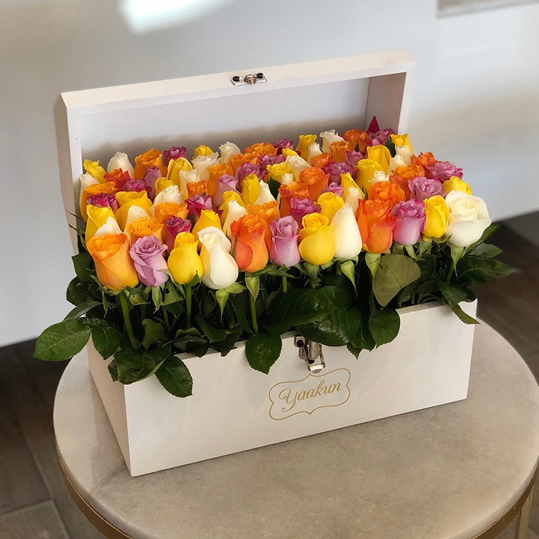 Cofre mediano blanco con 70 rosas en tonos alegres a media altura