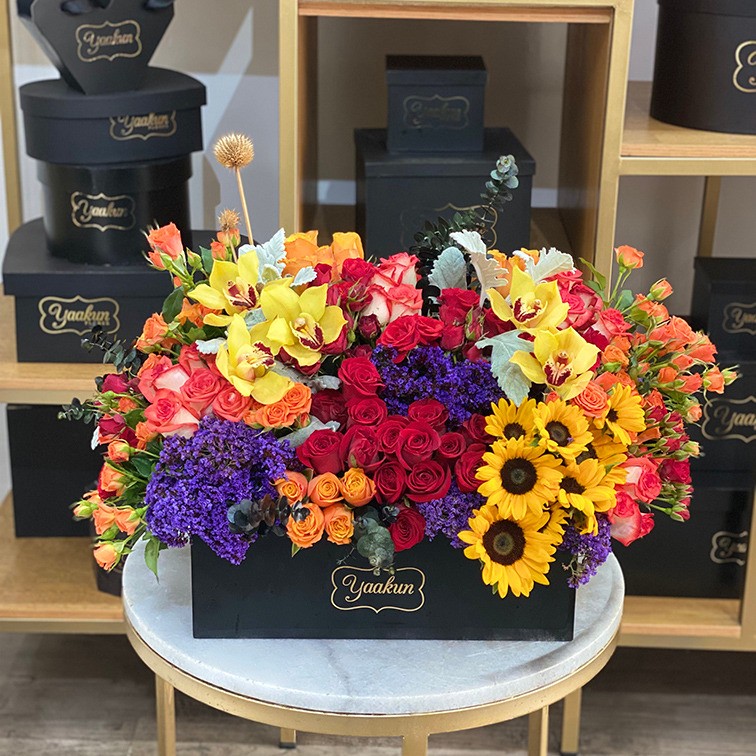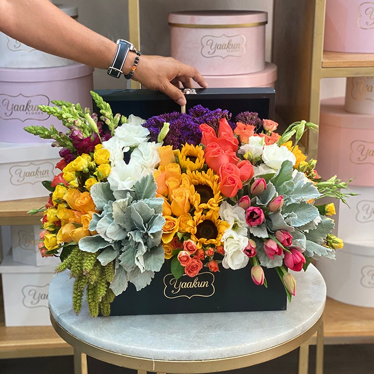 Cofre mediano en color blanco con 75 rosas finas como orquídeas, tulipanes, hortensias y amaranto.