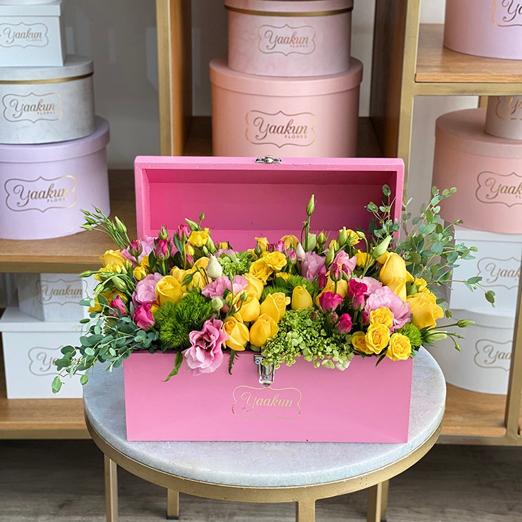 Hermoso cofre en color rosa con flores finas, con 50 rosas, baby rose, hortensias, tulipanes y follaje.