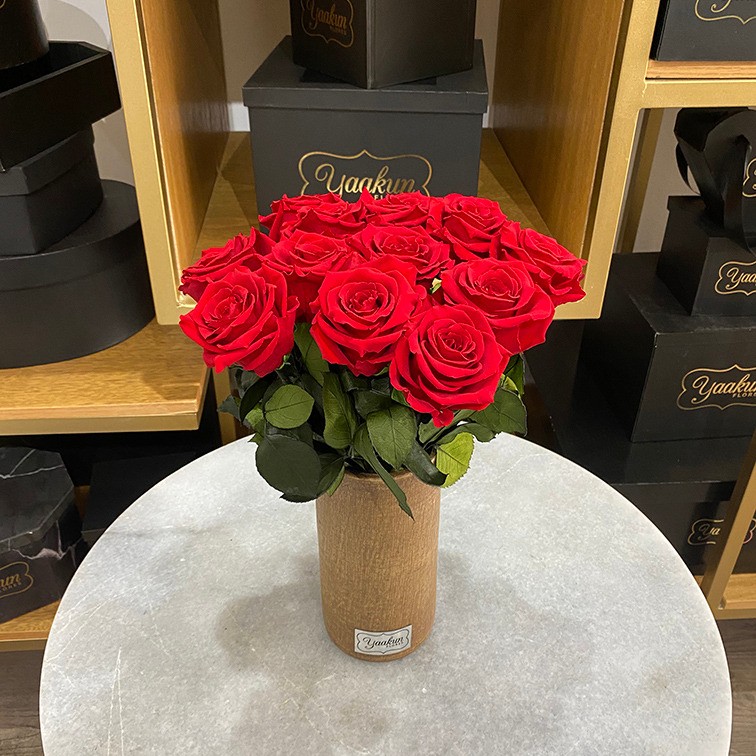 Hermoso arreglo floral con 20 rosas eternas complementadas con elegantes follajes