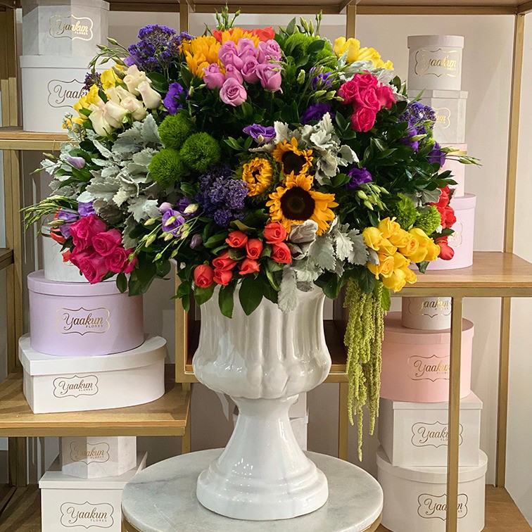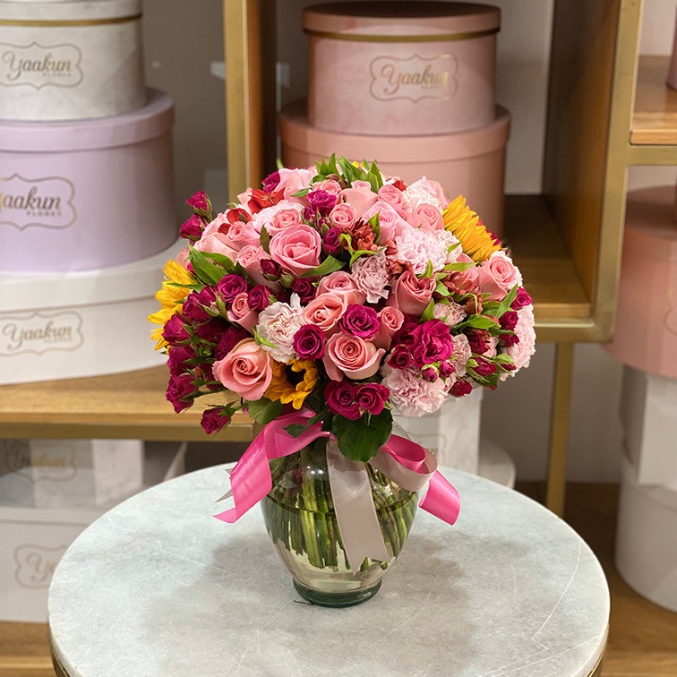 Hermoso diseño floral tipo bouquet en jarrón con 50 rosas , 4 girasoles , baby rose ,clavel y alstromerias