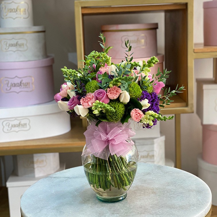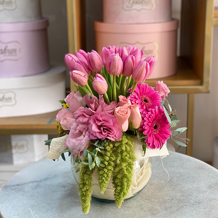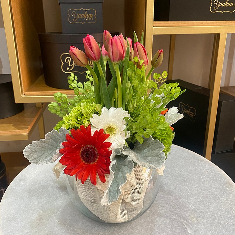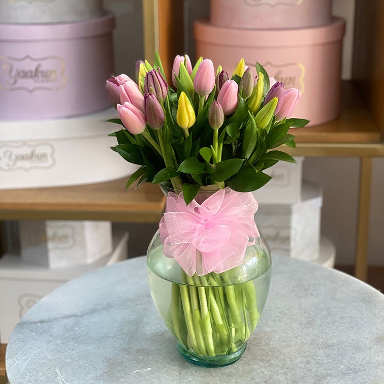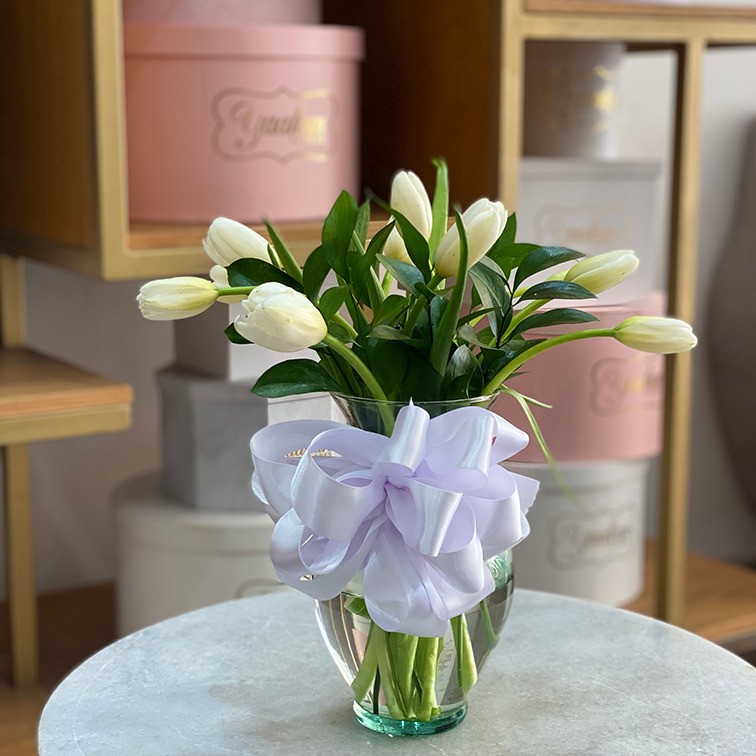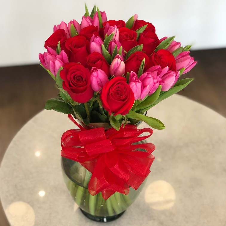 20 tulipanes & 12 rosas en un florero de cristal con moño de organza.