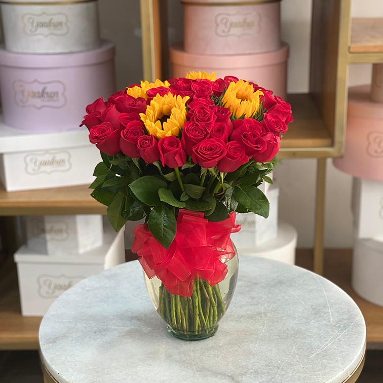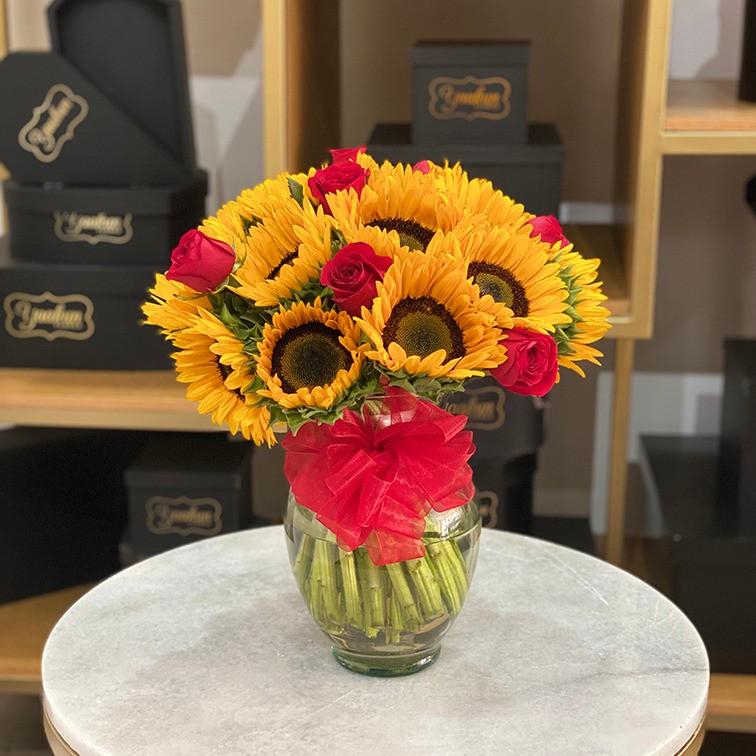 12 rosas y 20 girasoles en un florero de cristal con moño rojo de organza.