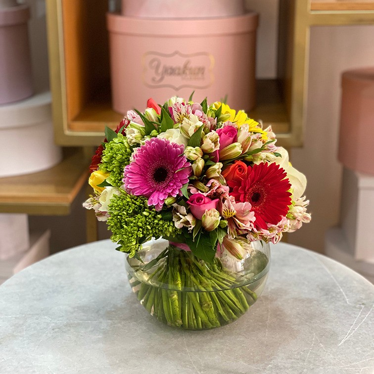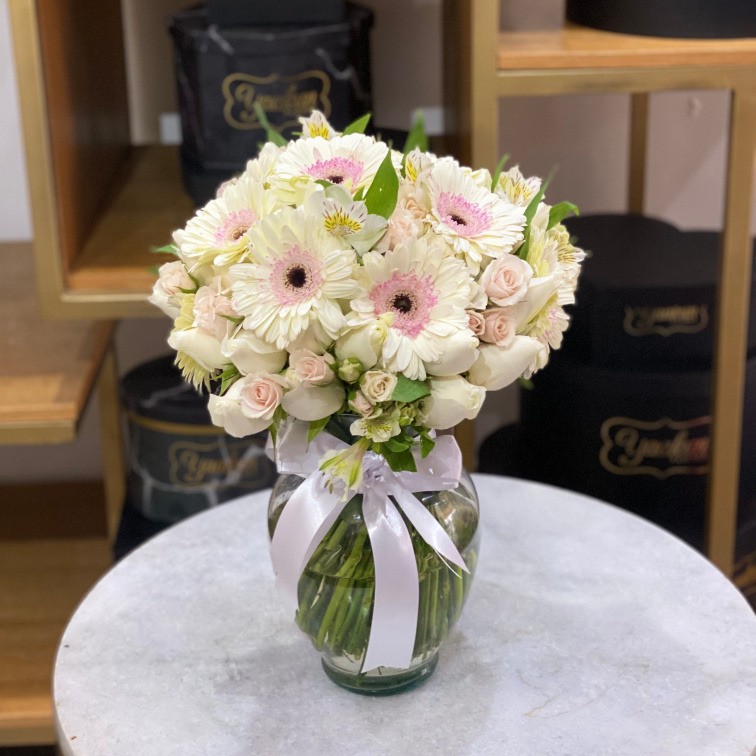 Jarron con 25 rosas, 6 geberesa, 4 girasoles y alstromerias