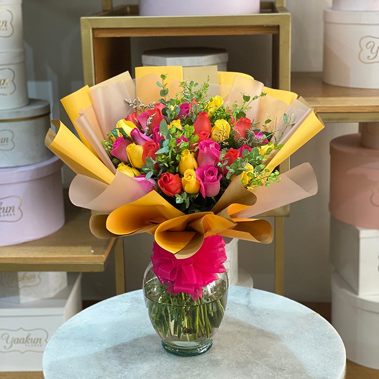 Arreglo floral en jarrón con 36 roas rojas y amarillas