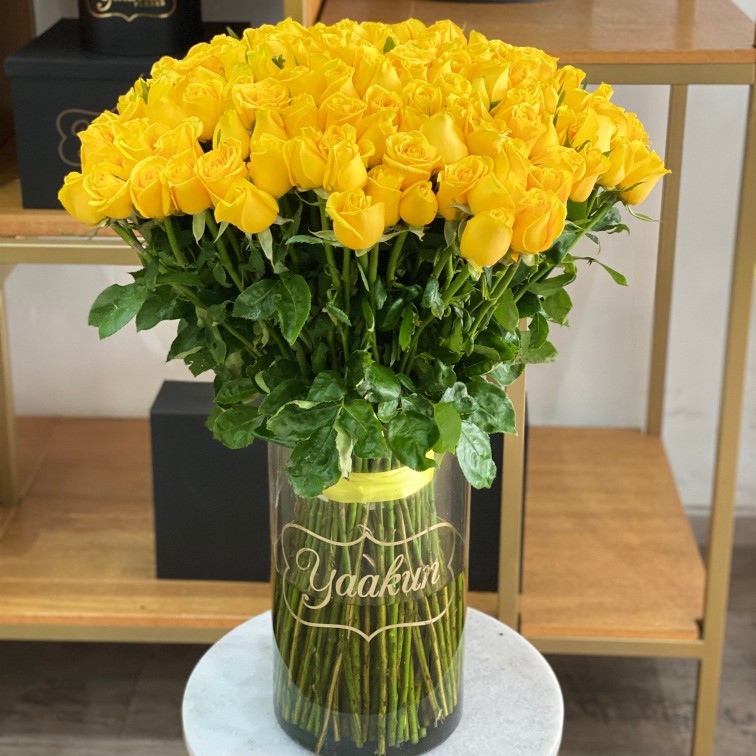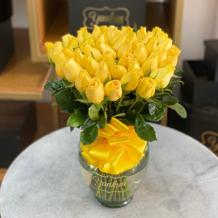 Hermoso y colorido arreglo en jarrón con 50 rosas amarillas