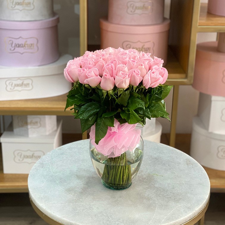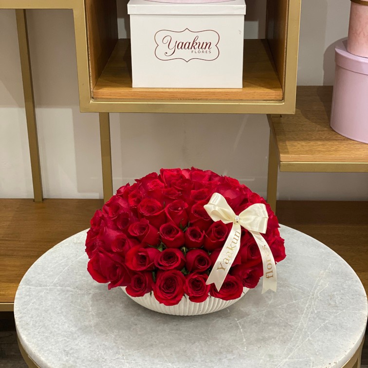 Hermoso arreglo floral con 36 rosas y follajes en jarrón