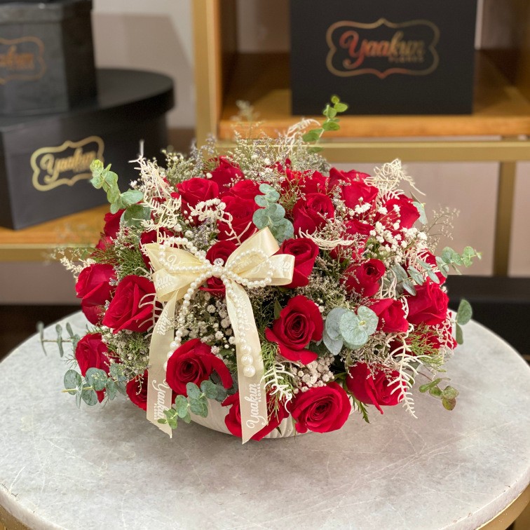 Hermoso y romántico arreglo floral con 50 rosas, lisianthus, clavel, alstros, ruscus y dólar.
