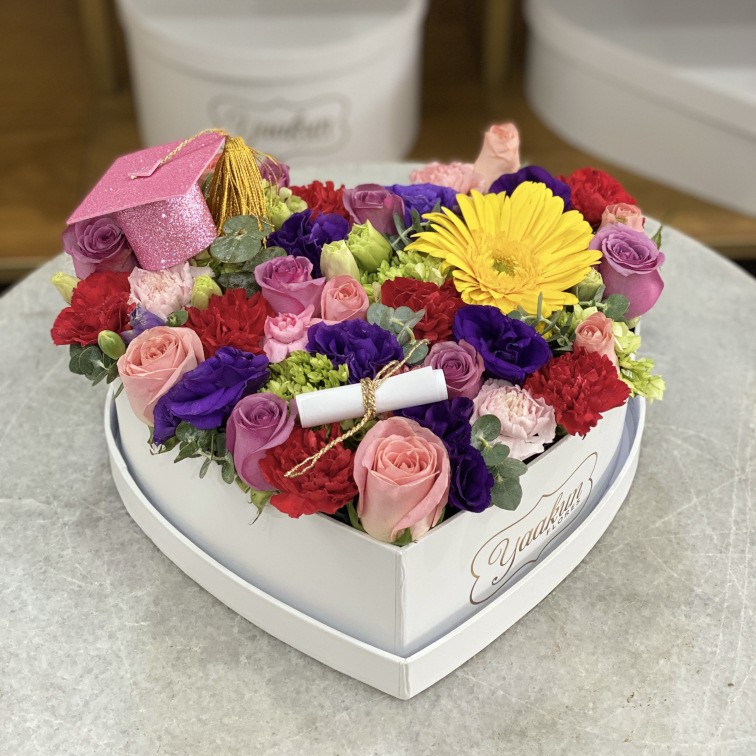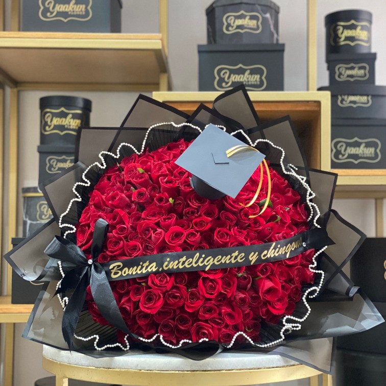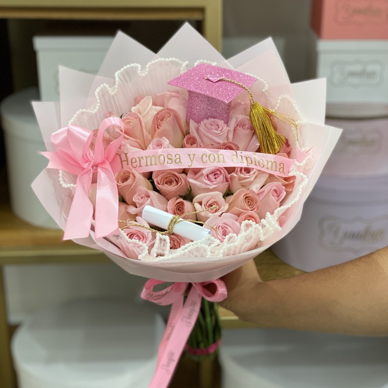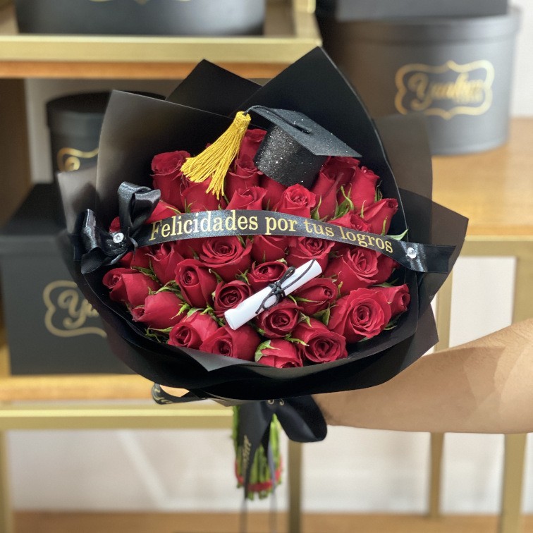 Hermoso detalle floral con 36 rosas, birrete y diploma