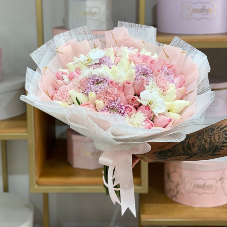 Hermoso y delicado arreglo floral con tonos rositas una combinación de 75rosas, rosaxanas, clavel y orquídeas