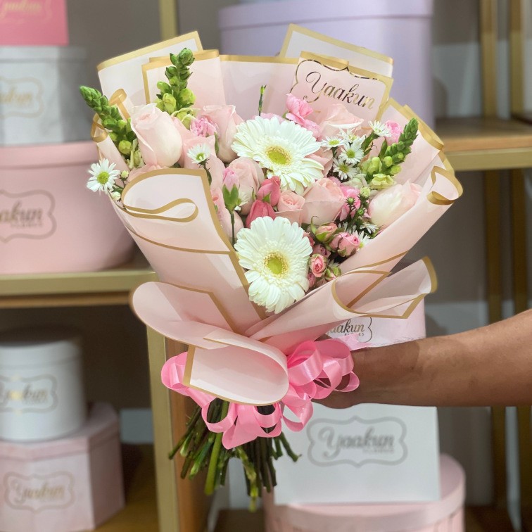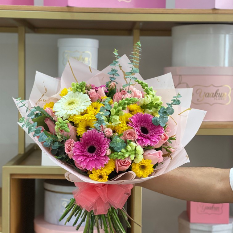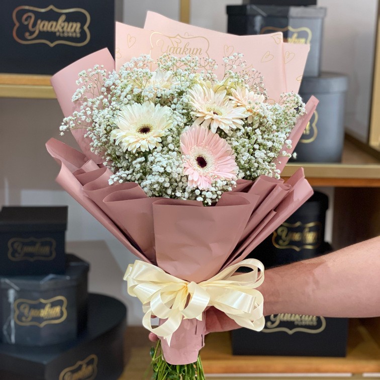 Hermoso y delicado arreglo floral compuesto por 6 gerberas, baby de 2 tonos, lisianthus, toques de clavel, flores tintas, envuelto en malla y papel coreano
