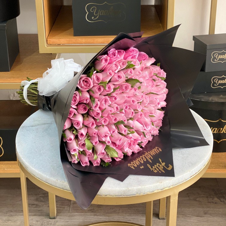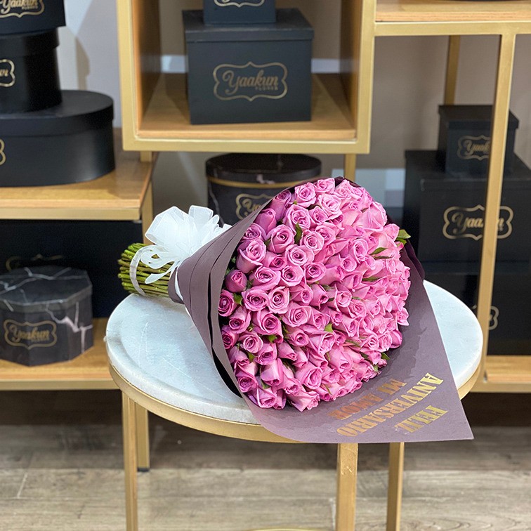 Hermoso arreglo de 50 rosas lila con gypso y papel coreano