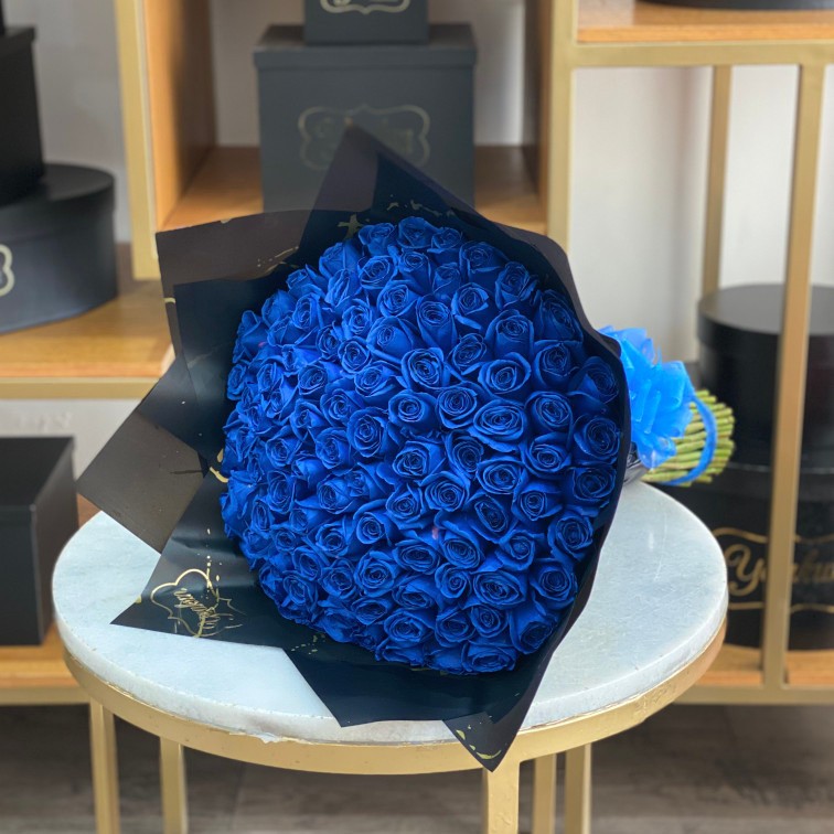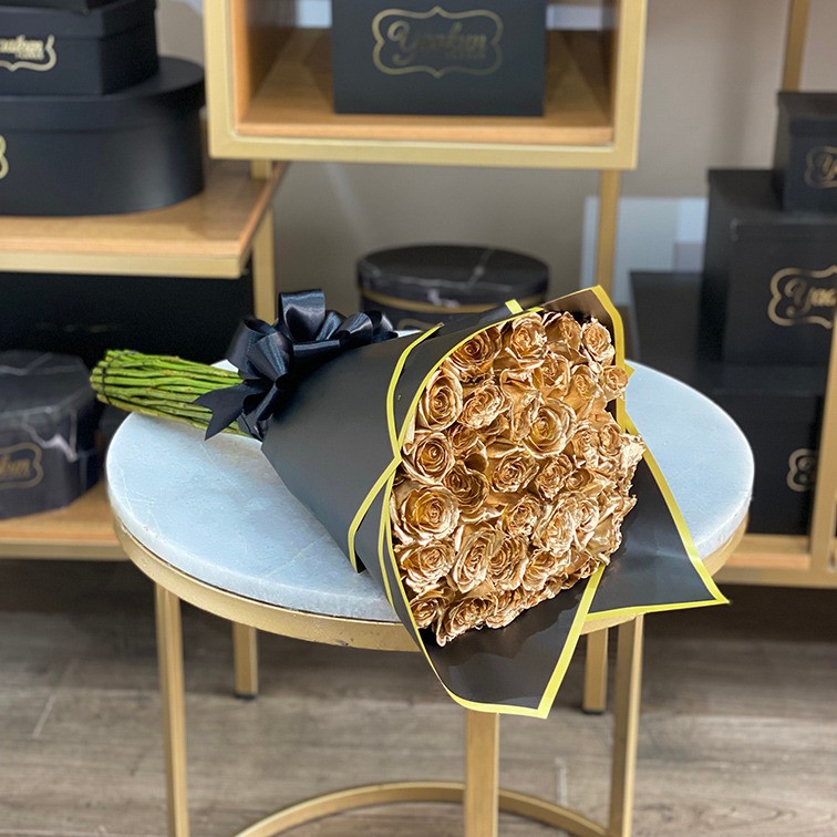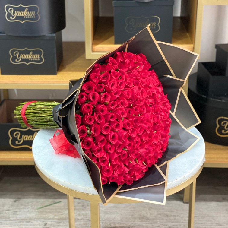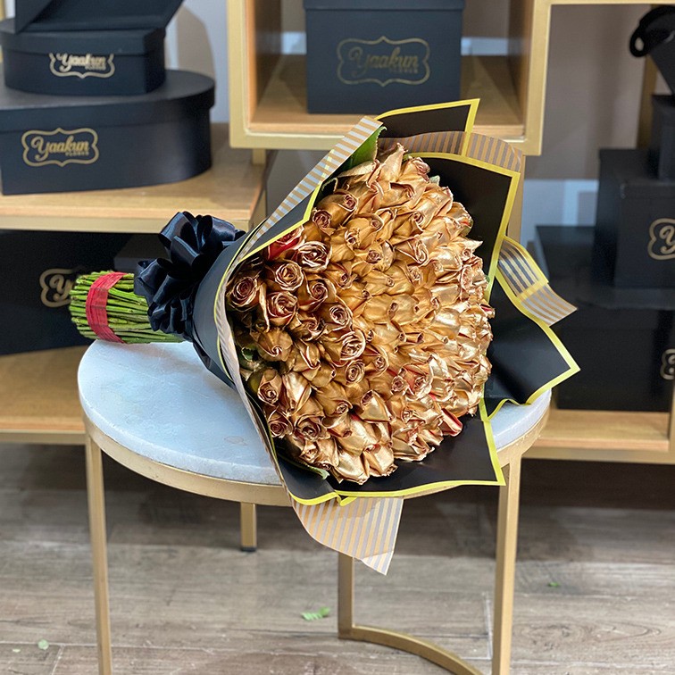 Hermoso arreglo floral con 100 rosas naranjas y papel coreano