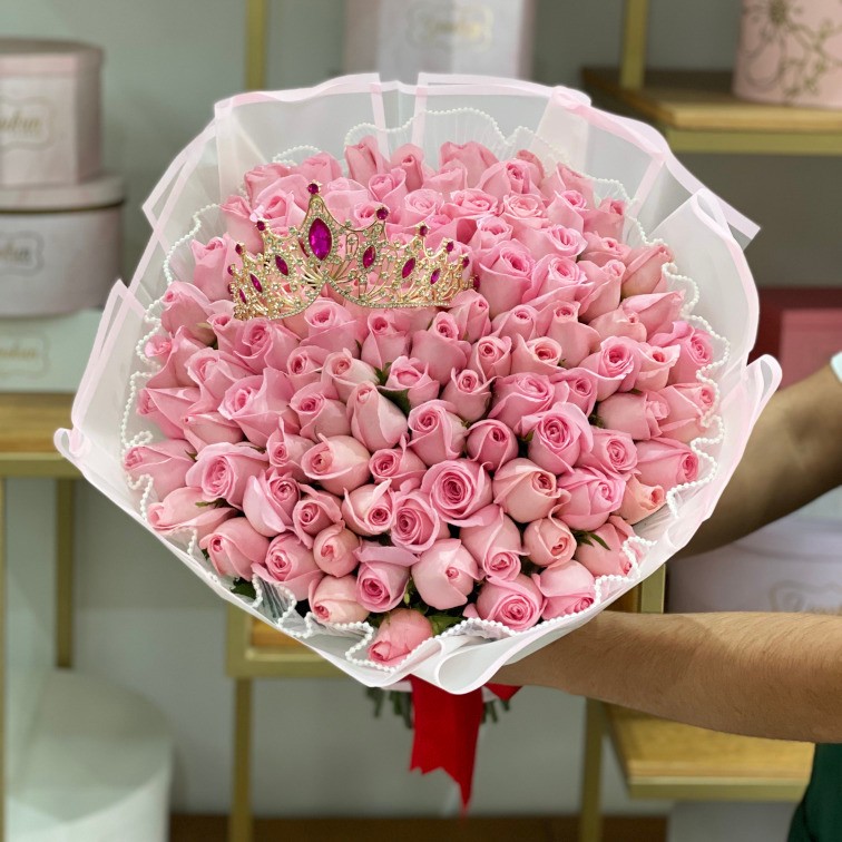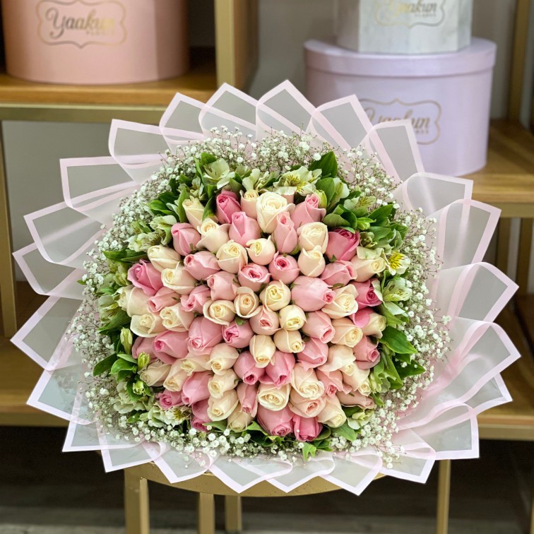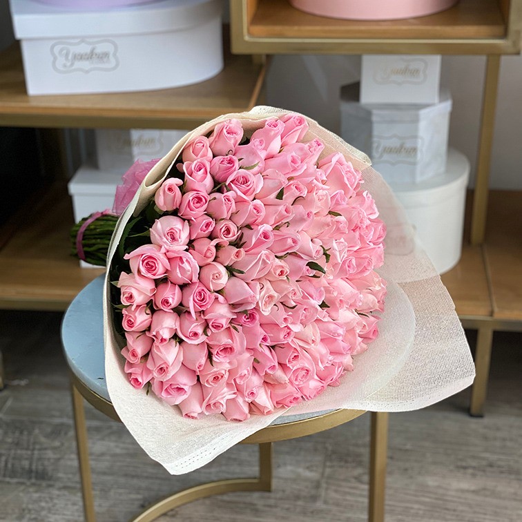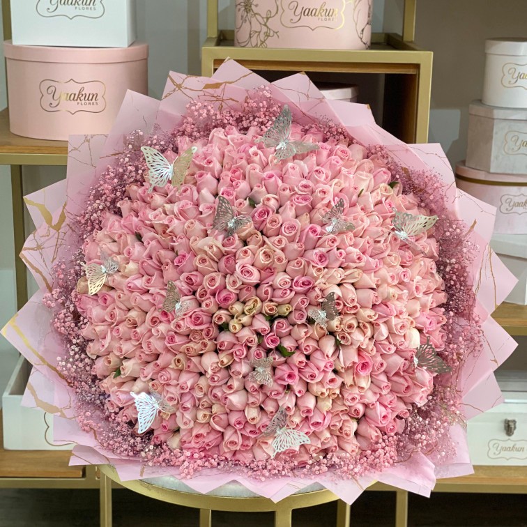 Hermoso arreglo floral en tonos rosas con 100 rosas, 3 lilis, 20 tulipanes y toques de lisianthus