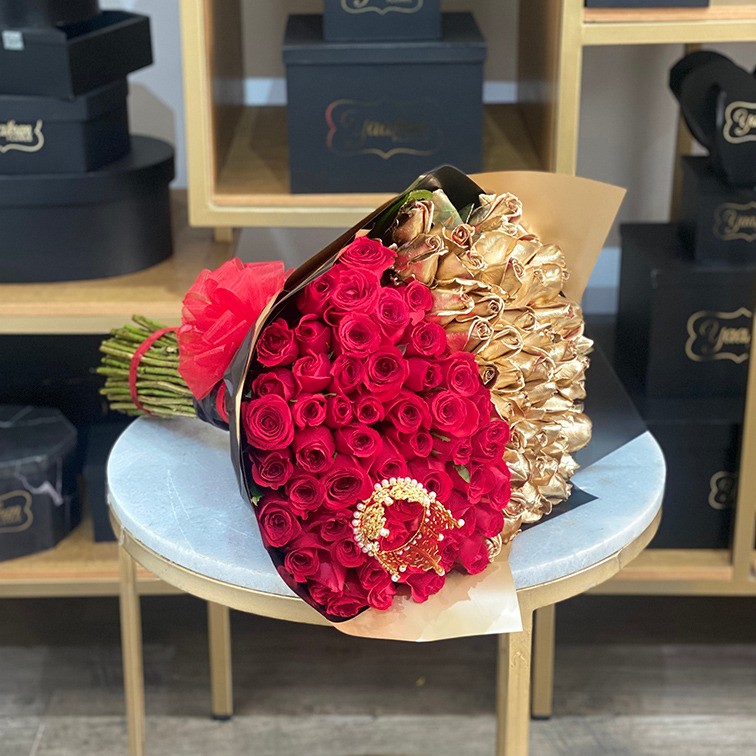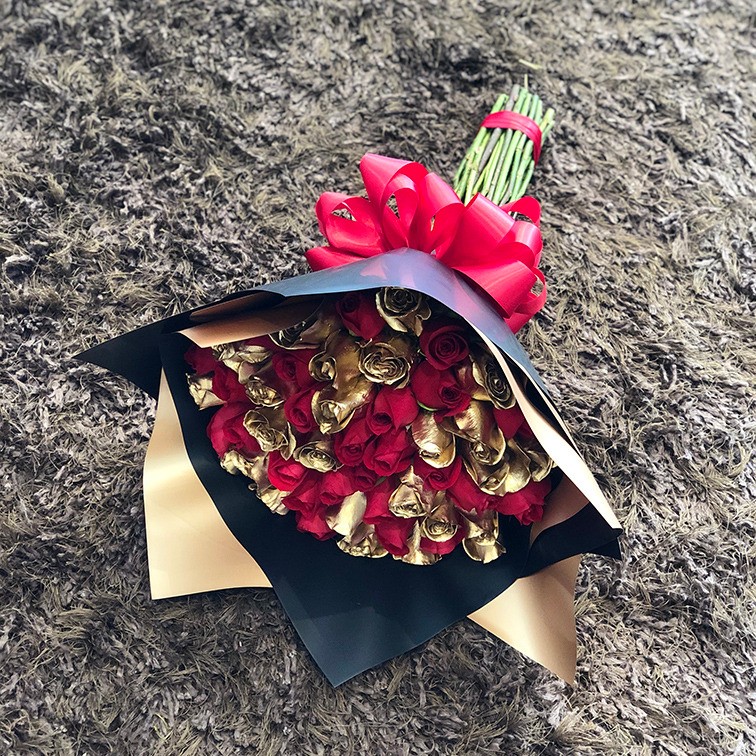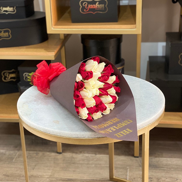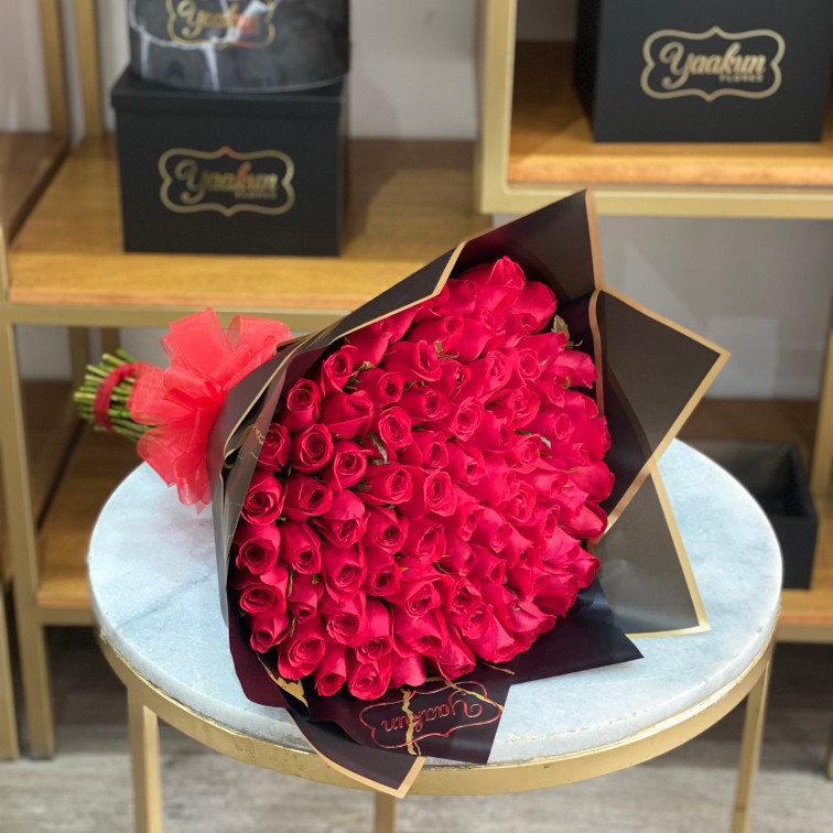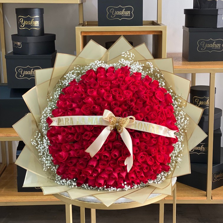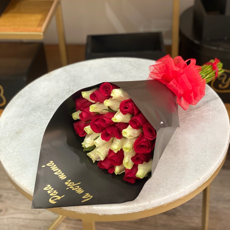 Hermoso y elegante arreglo floral con 50 rosas rojas con contorno de alstro blanca y gypso envuelto en papel coreano