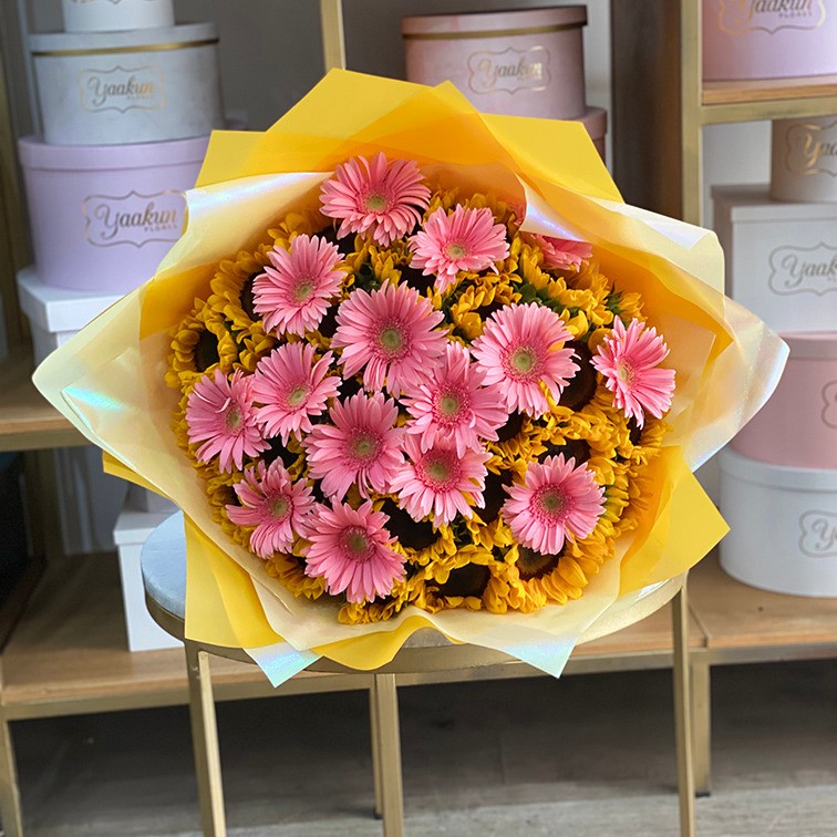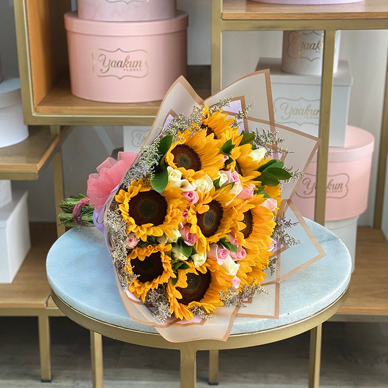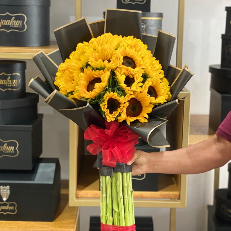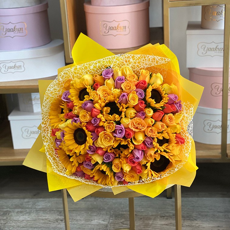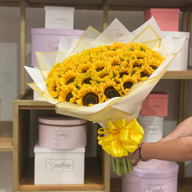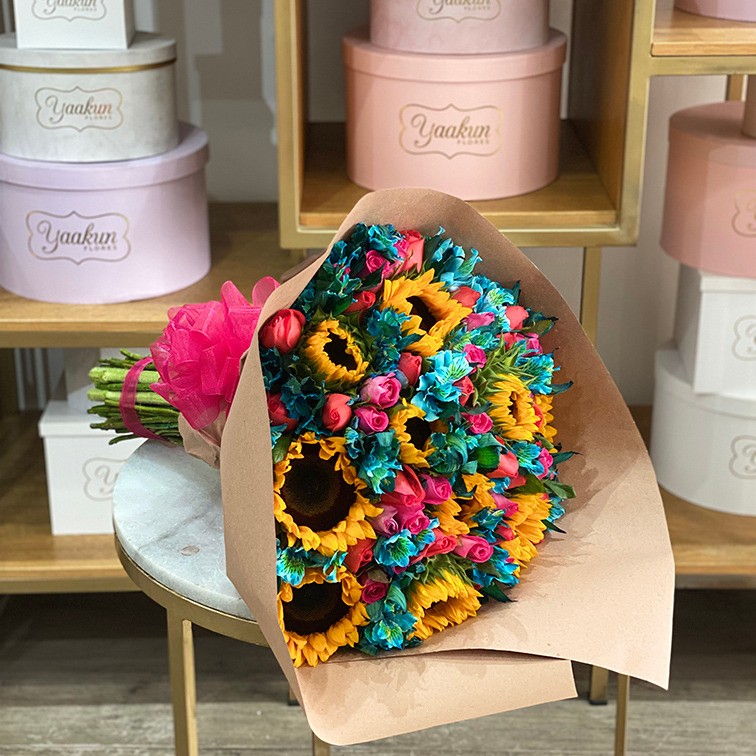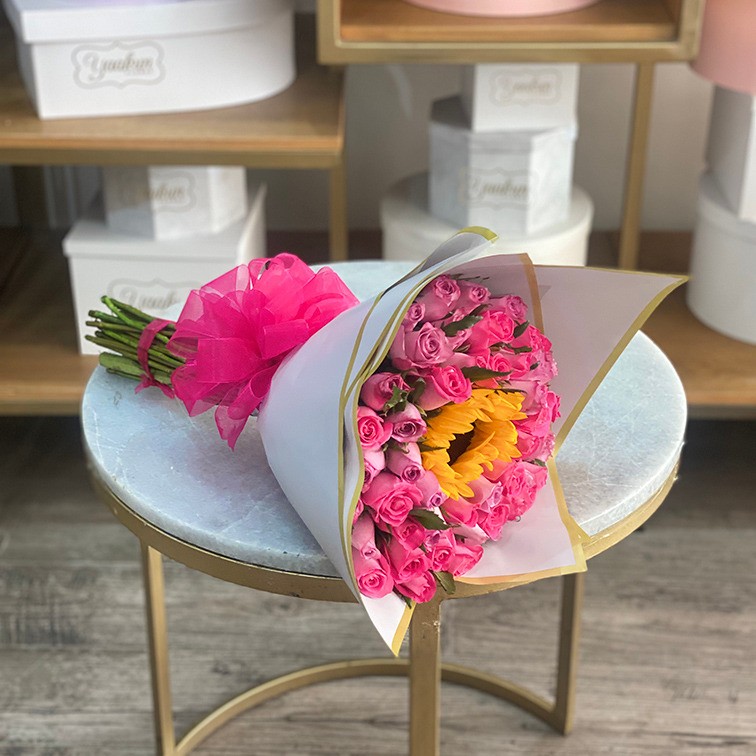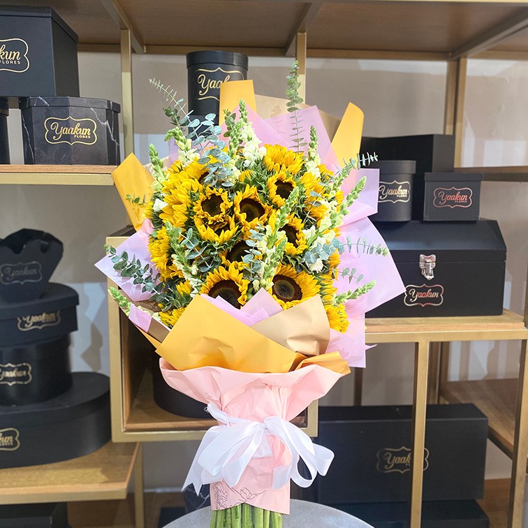 Hermoso arreglo floral con 20 girasoles y 24 rosas
