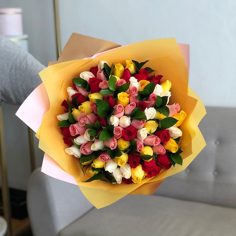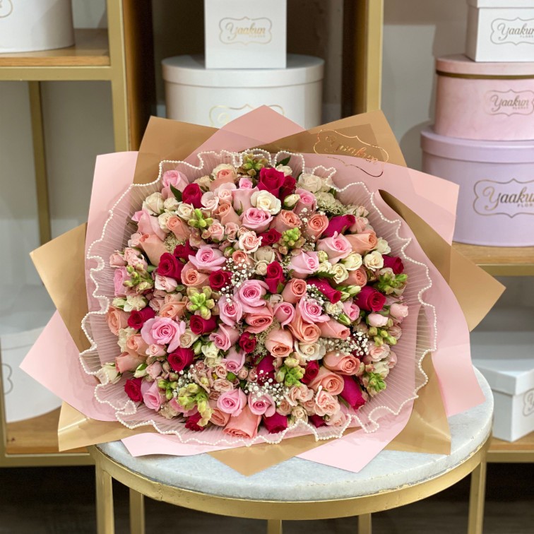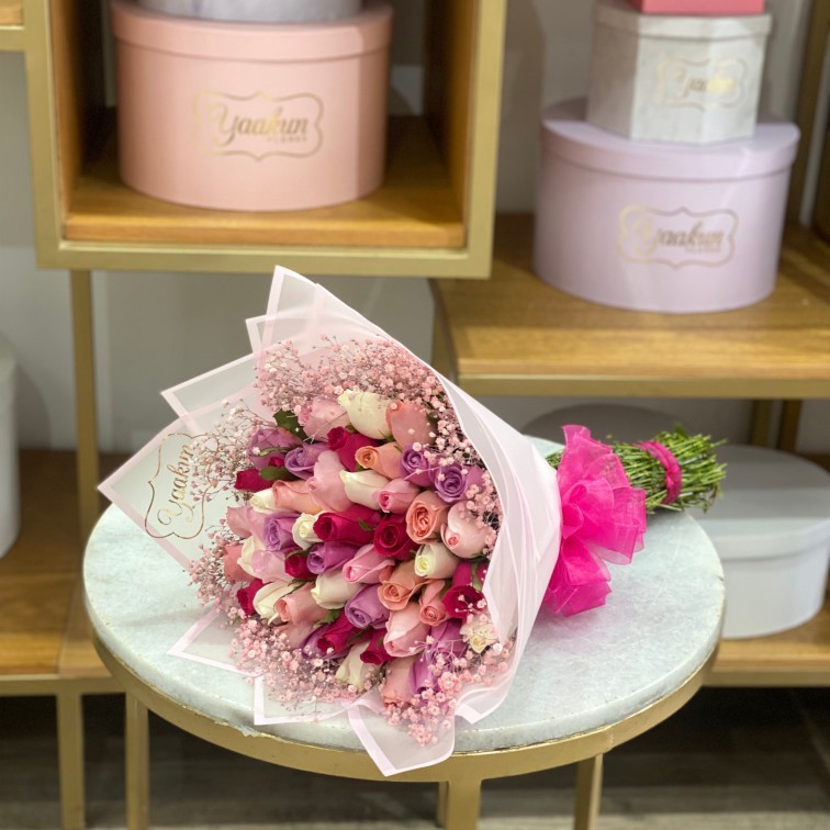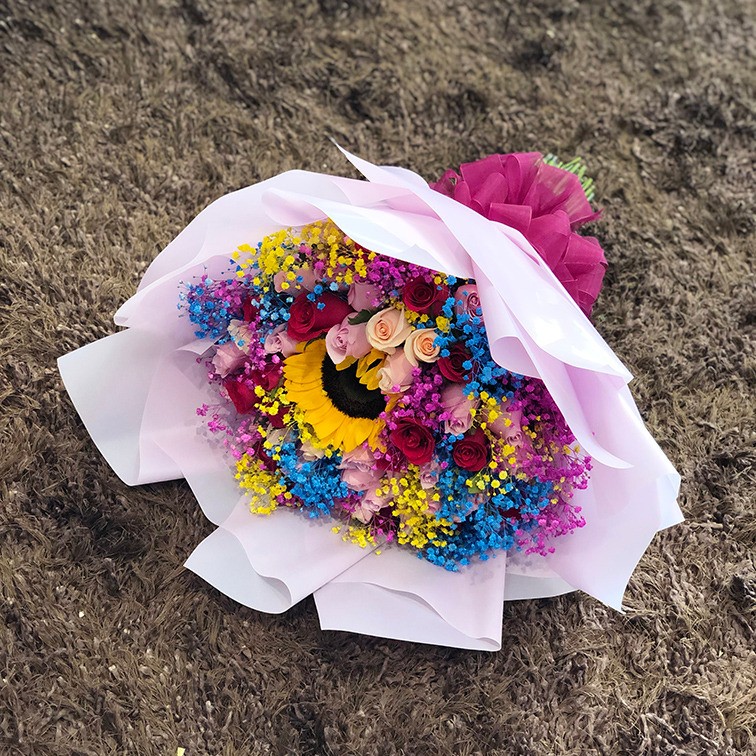 Hermoso y colorido arreglo floral con 50 rosas, lisianthus clavel, rosas inglesas, hortensias con papel coreano