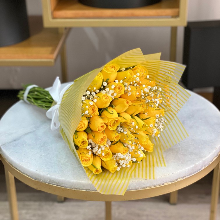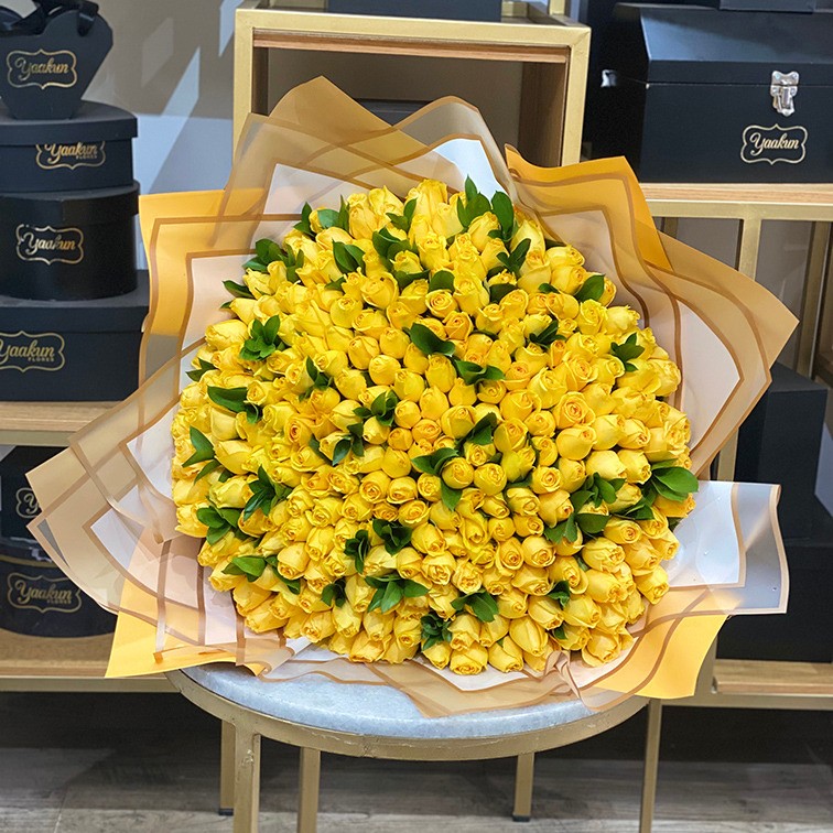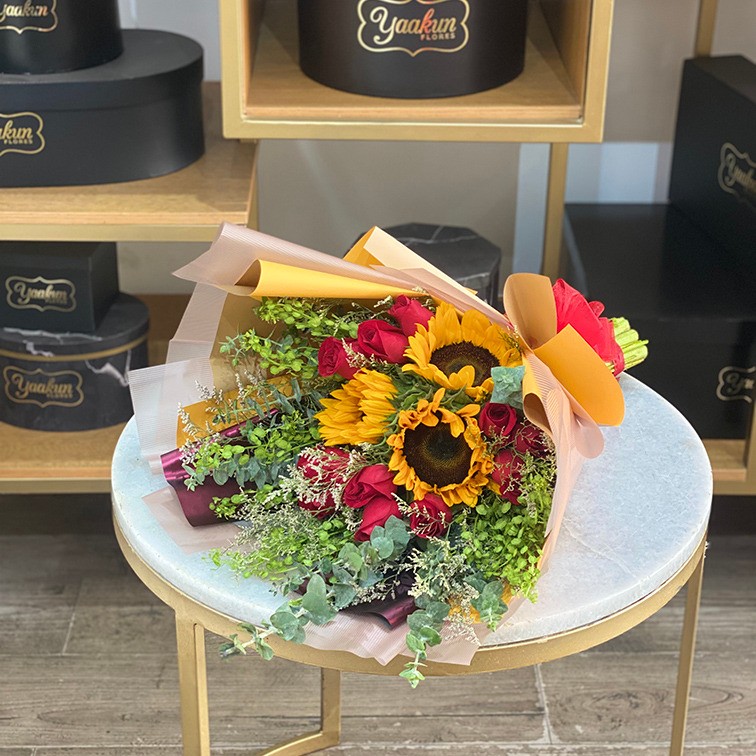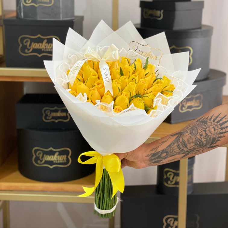 Hermoso arreglo floral con 12 rosas amarillas, 5 girasoles, Green, 6 gerberas, vikingo, baby rose, lisianthus, lenteja, guny y follajes