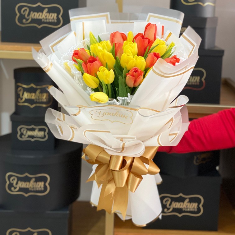 Hermoso y delicado arreglo floral con 20 tulipanes y 15 rosas