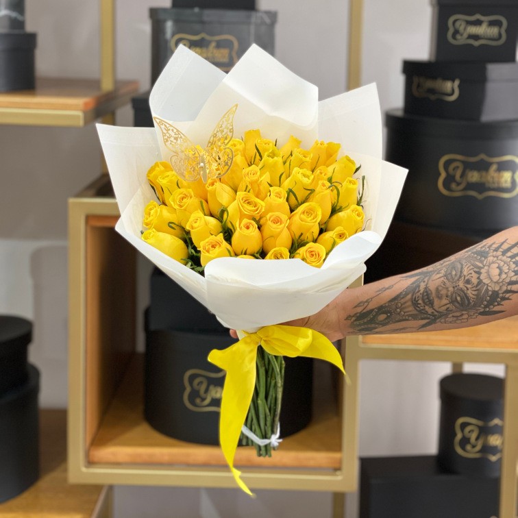 Hermoso arreglo con 300 rosas amarillas en forma de corazón con toque de 7 mariposas doradas