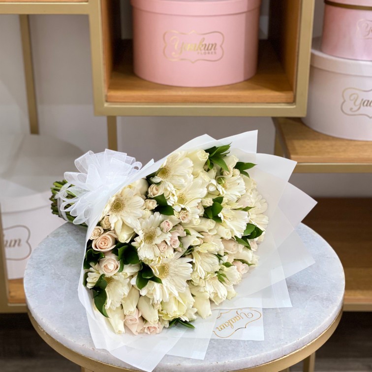 Hermoso arreglo floral con 16 rosas blancas, gladiolas, lisianthus, concador, baby rose blanca y papel coreano