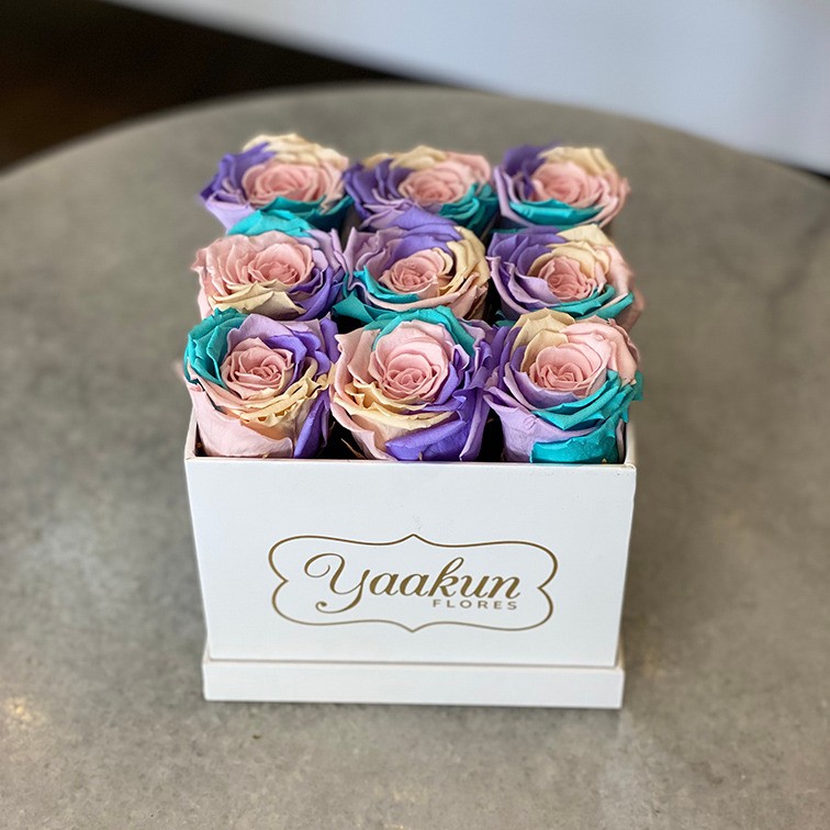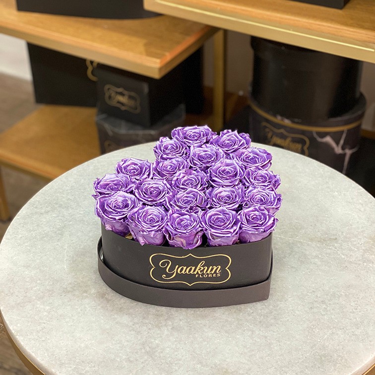 Hermoso y elegante diseño floral con 9 rosas eternas en color lila