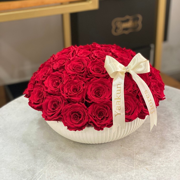 Hermoso y clásico arreglo floral con 60 rosas eternas aprox