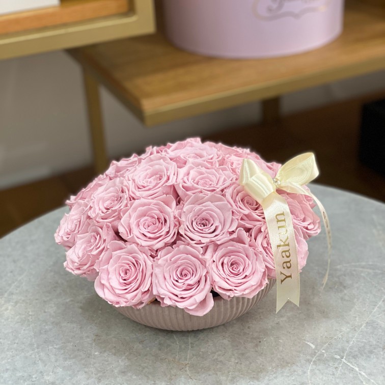 Hermoso arreglo floral con 24 rosas eternas en color rosa pastel
