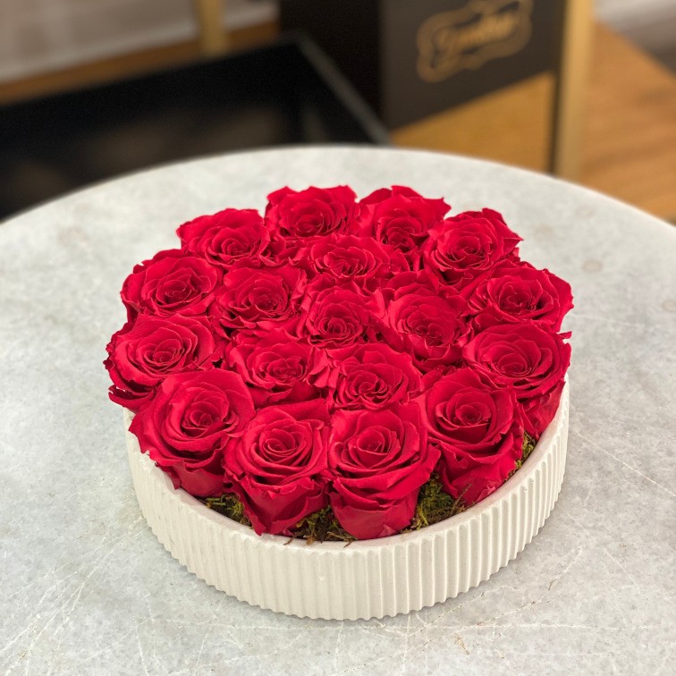 Hermoso arreglo floral con 18 rosas eternas en color rojo