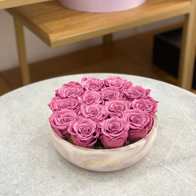 Hermoso y elegante diseño floral con 14 rosas eternas en color rosa palo
