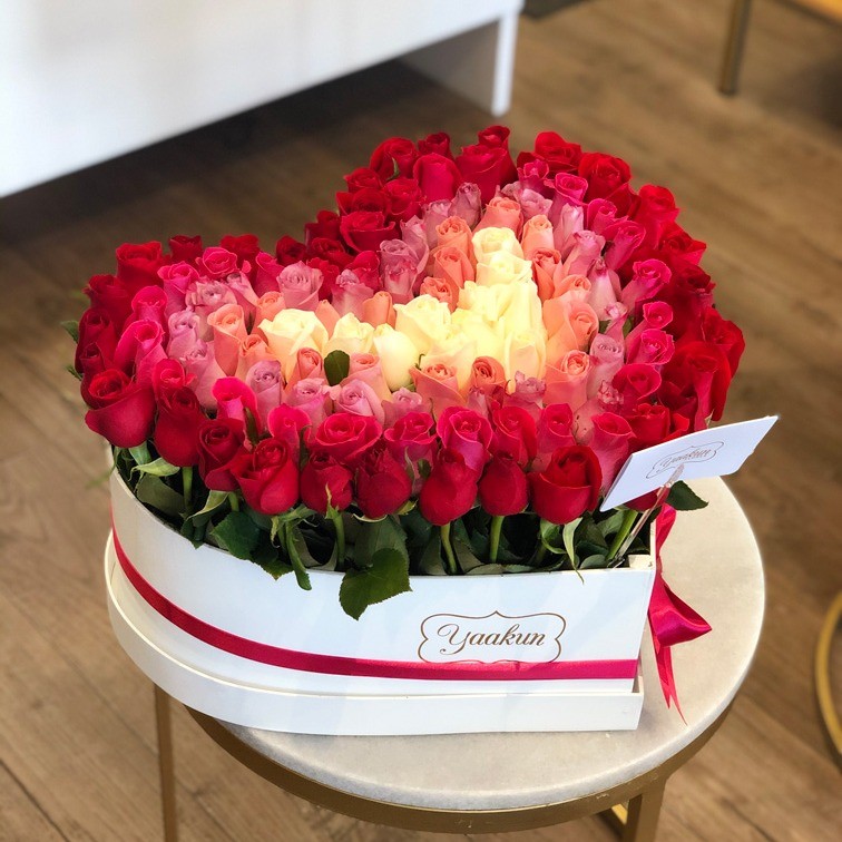 100 rosas con tallo alto en efecto degradado con varias tonalidades en caja en forma de corazón