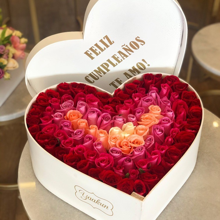 100 rosas en efecto degradado con varias tonalidades en caja en forma de corazón con tapa