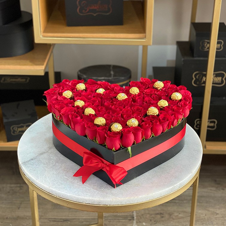 Caja corazón con 100 rosas rojas y 16 ferreros acomodados en forma de corazón.
