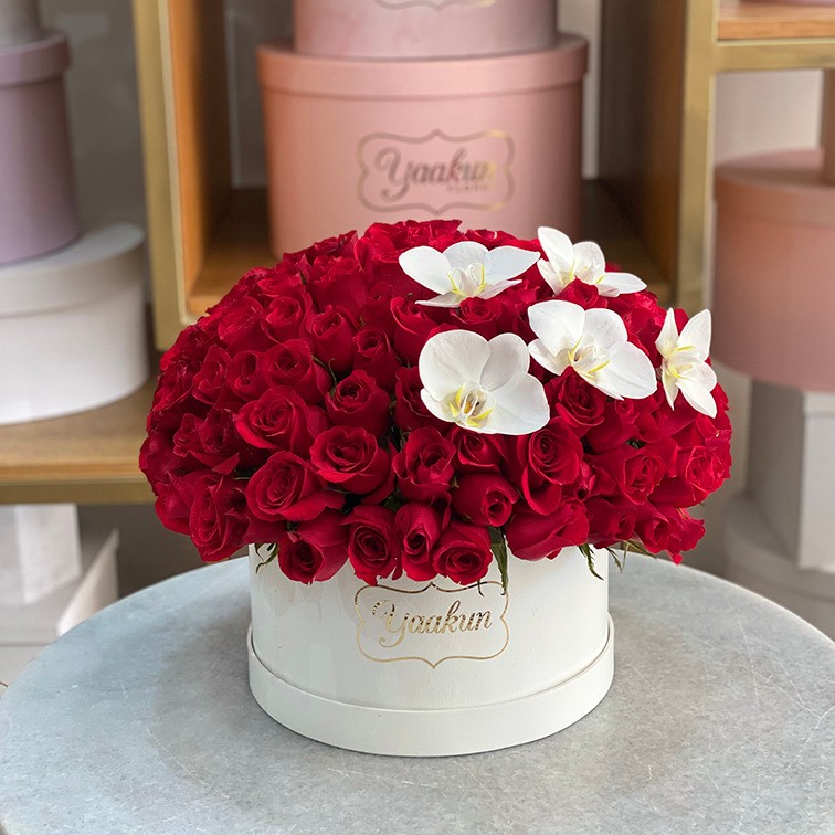 Elegante diseño en esfera de 120 rosas rojas incorporadas a la perfección con detalle de orquídeas.