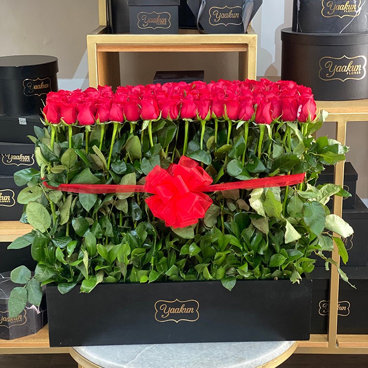 Este espectacular diseño está montado como un jardín sobre una caja negra Yaakun. Consta de 150 rosas rojas y tiene una medida aproximada de 60 cm de largo. El regalo perfecto para alguien especial.