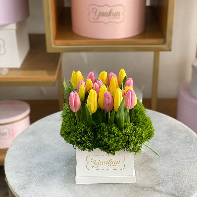 Sácale una sonrisa a esa persona especial con esta hermosa caja con 20 tulipanes en color rosa y amarillo. Contiene también ruscus y green.