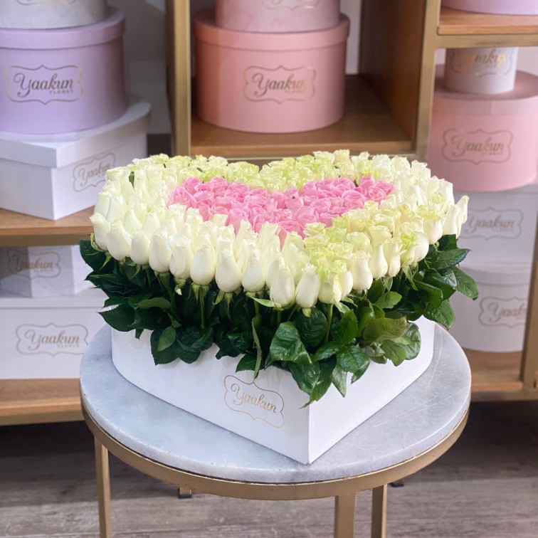 200 rosas blancas y rositas en caja en forma de corazón tipo jardín