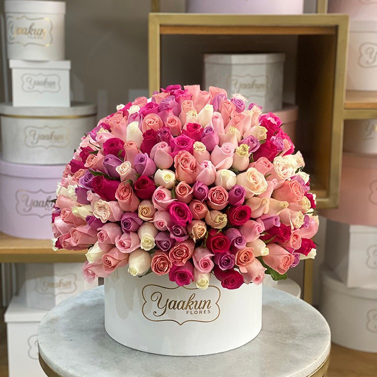Elegante diseño de 200 rosas tonos pastel incorporadas a la perfección su tapa inclinada detras que da apariencia de estar semi-abierto