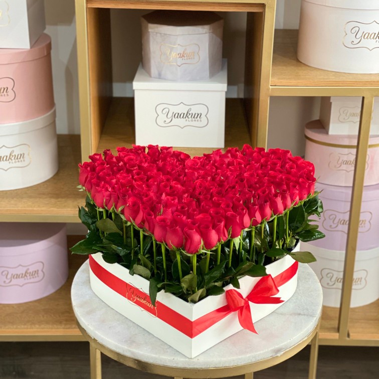Envíale este corazón de 200 rosas rojas en caja en forma de corazón tipo jardín.