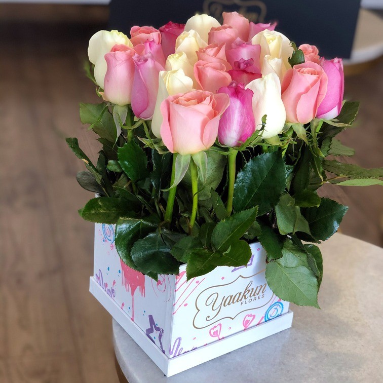 Elegante caja edición especial pintada a mano con 25 rosas en tonos pastel altas perfecta para alegrar su día.