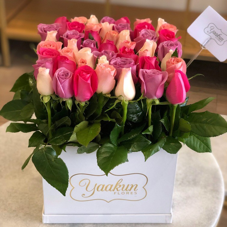 Bello diseño de jardín con 49 rosas en tonos pastel con calidad de exportación en una caja blanca.