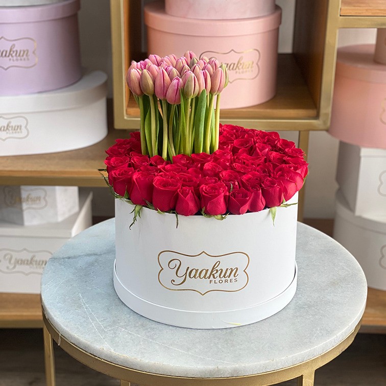 Diseño romántico de 50 rosas aproximado con 30 tolipanes en caja circular blanca.