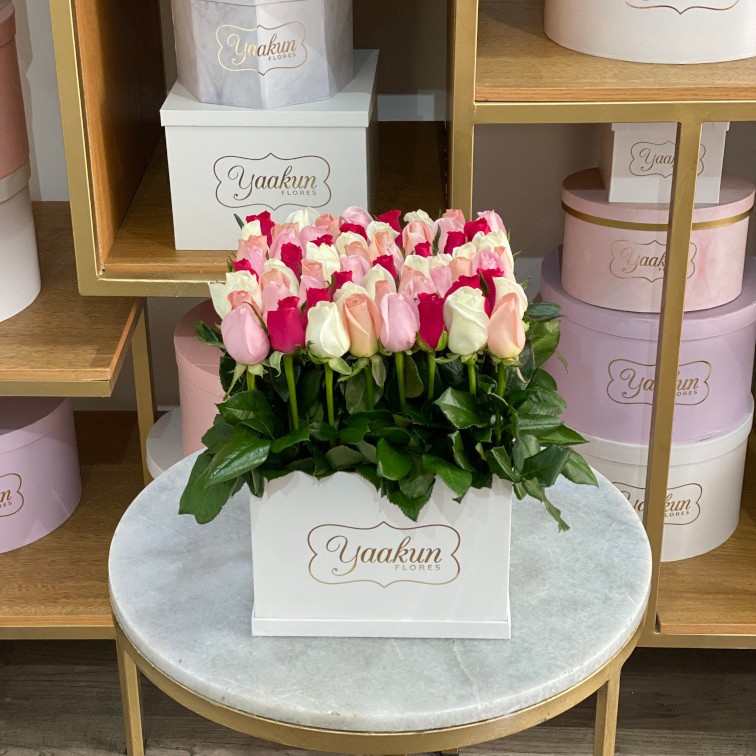 Hermoso diseño de jardín con 65 rosas en 4 tonalidades sobre una caja blanca.