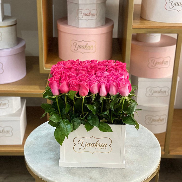 Diseño en tono rosa mexicano con 65 rosas sobre una caja Yaakun.