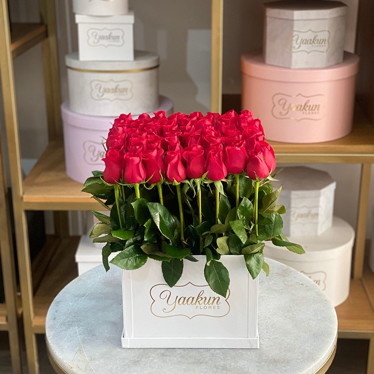 Bello diseño de jardín con 65 rosas rojas calidad de exportación en una caja blanca.