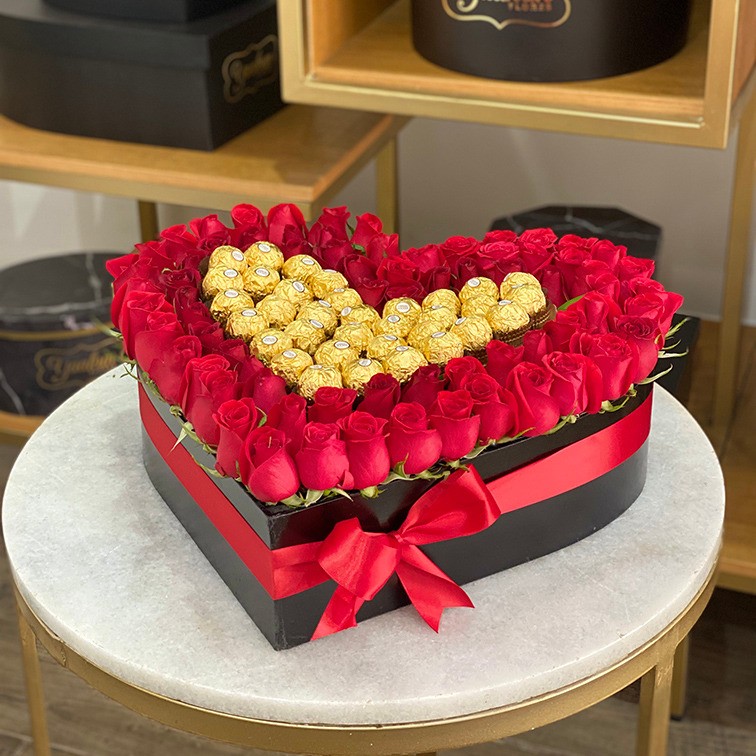 Caja en forma de corazón con 65 rosas rojas, expresa tus sentimientos con esta hermosa caja y chocolates ferrero.